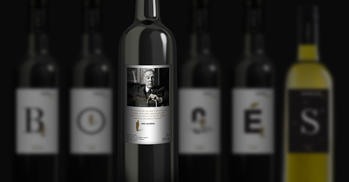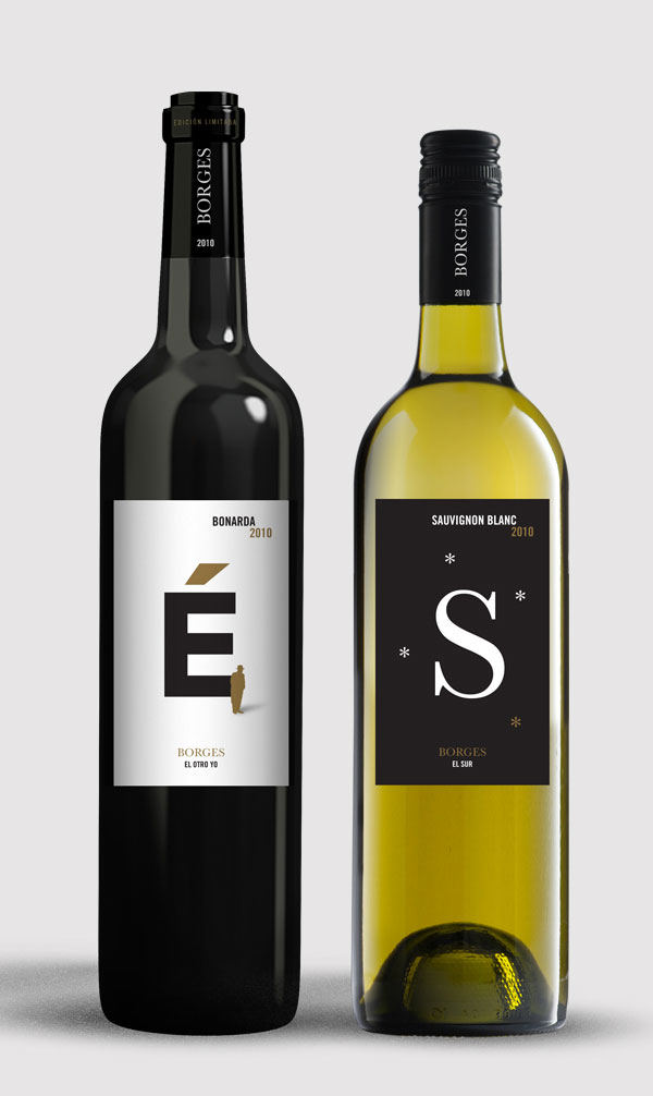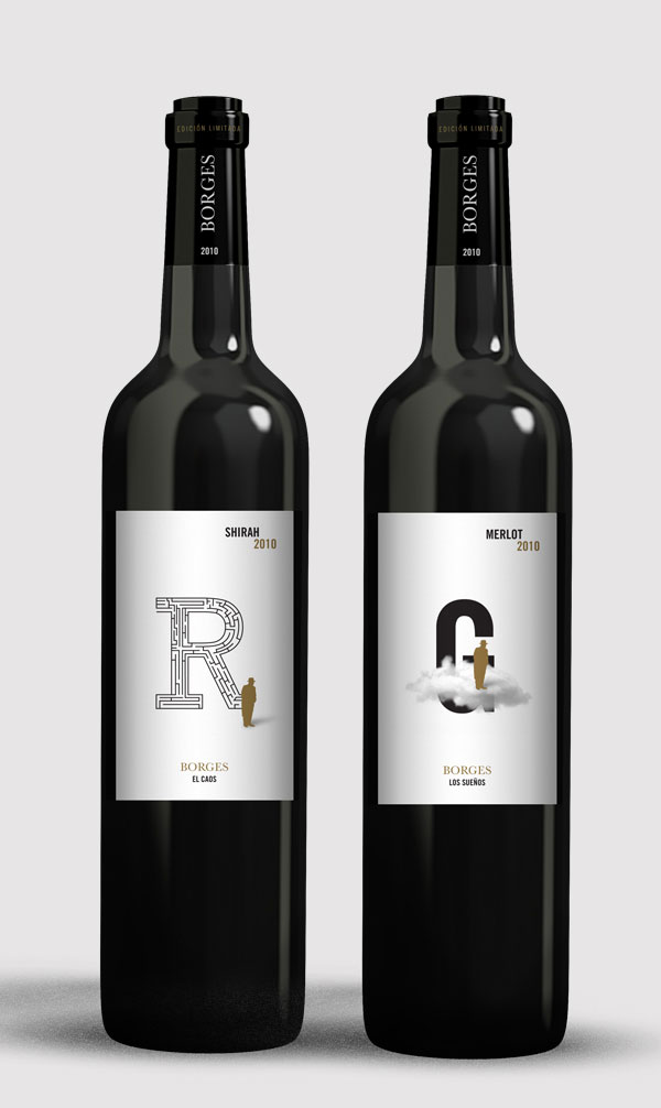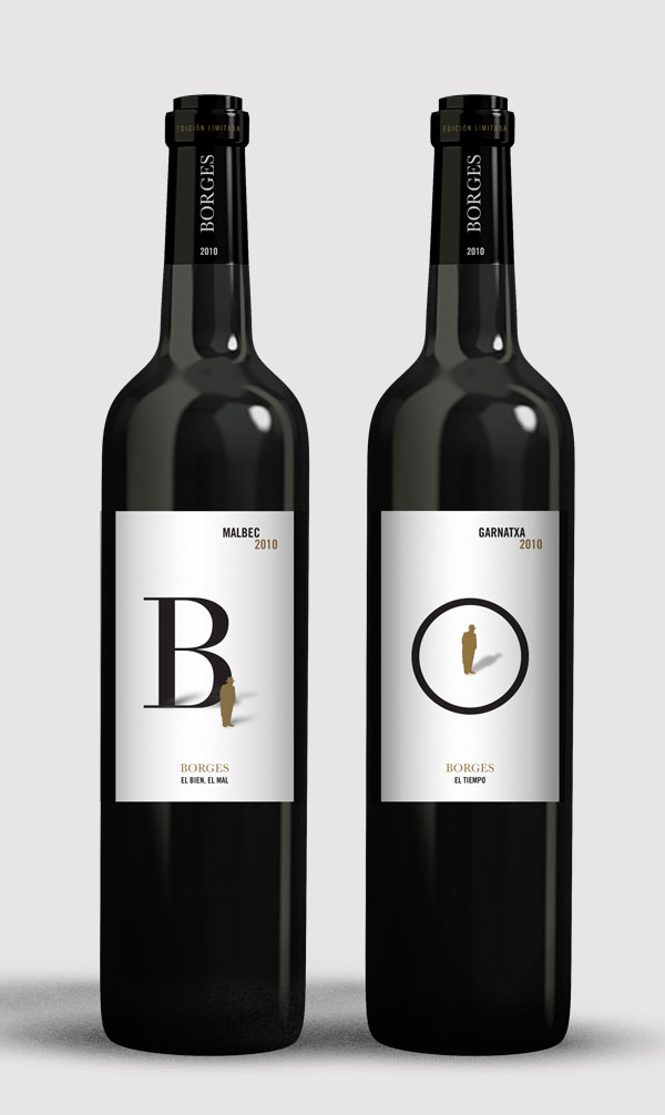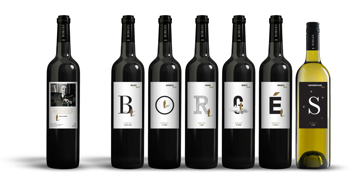 El ejercicio consitió en proyectar un sistema de etiquetas de vino donde un tema conectara a cada varietal dentro de la familia. "Vino de autor" surge con la idea de relacionar la literatura con el buen vino y se eligieron dos autores para trabajar. En "Borges", ayudado por la tipografía, se ilustraron seis símbolos recurrentes en la literatura del autor. El proyecto fue realizado en el curso "Dirección de arte" dictado por Fernando Gutierrez, dentro del Máster en Tipografía Avanzada de EINA.