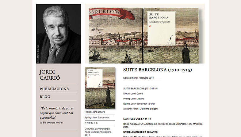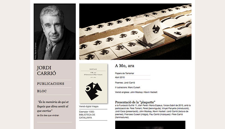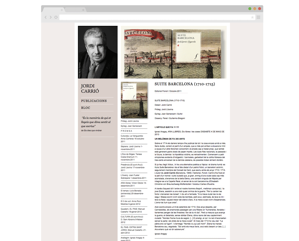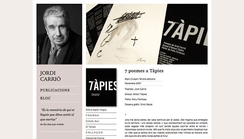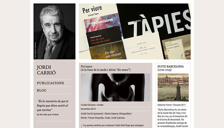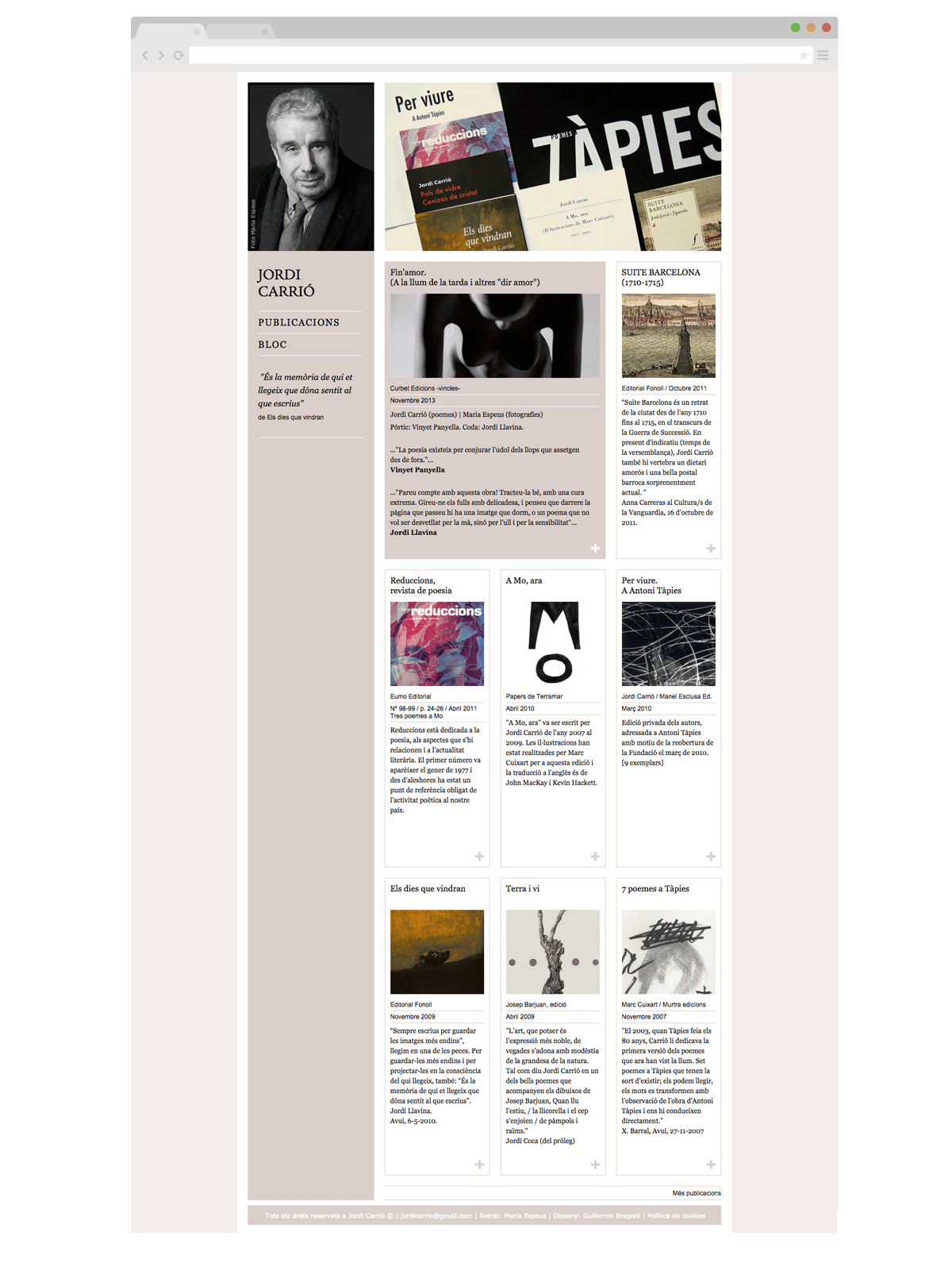 Un diseño sencillo y funcional. Con una home estructurada en forma de mosaico pueden apreciarse todos sus trabajos. Al acceder a cada obra, la información se estructura como un blog, lo cual para el cliente resulta habitual y sencillo de actualizar. Online: www.jordi-carrio.cat