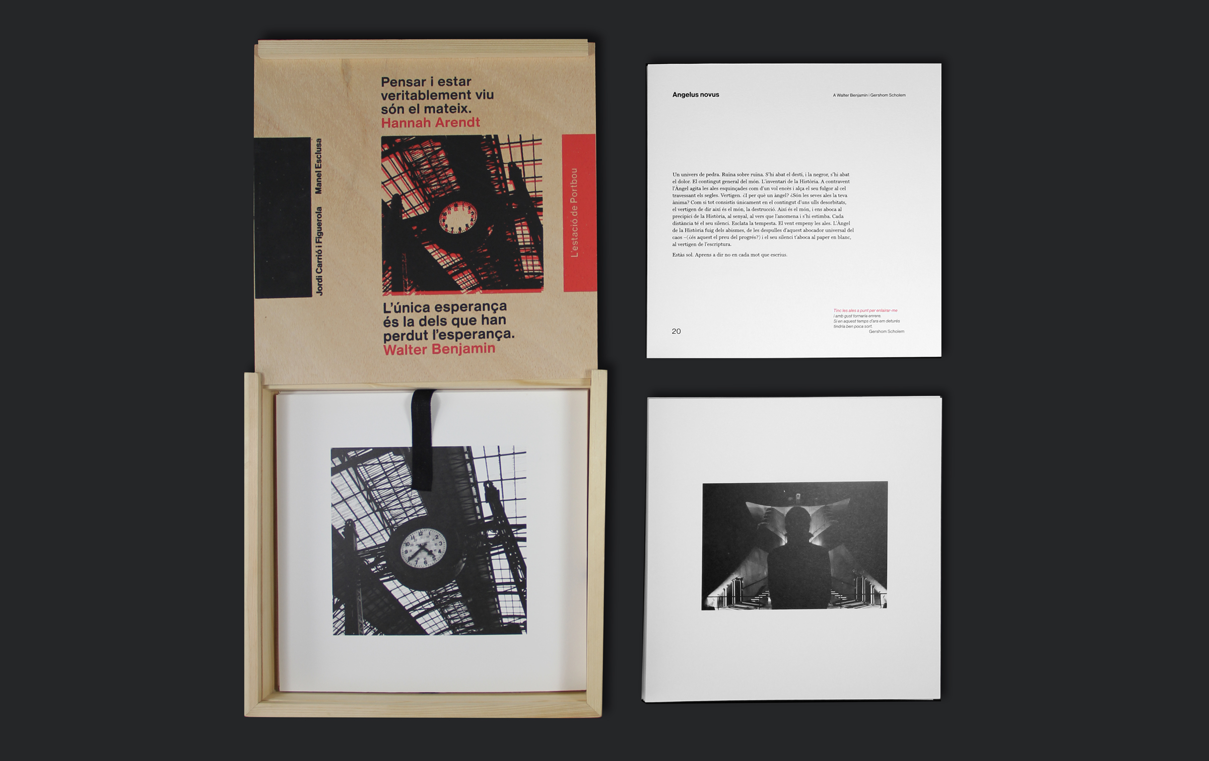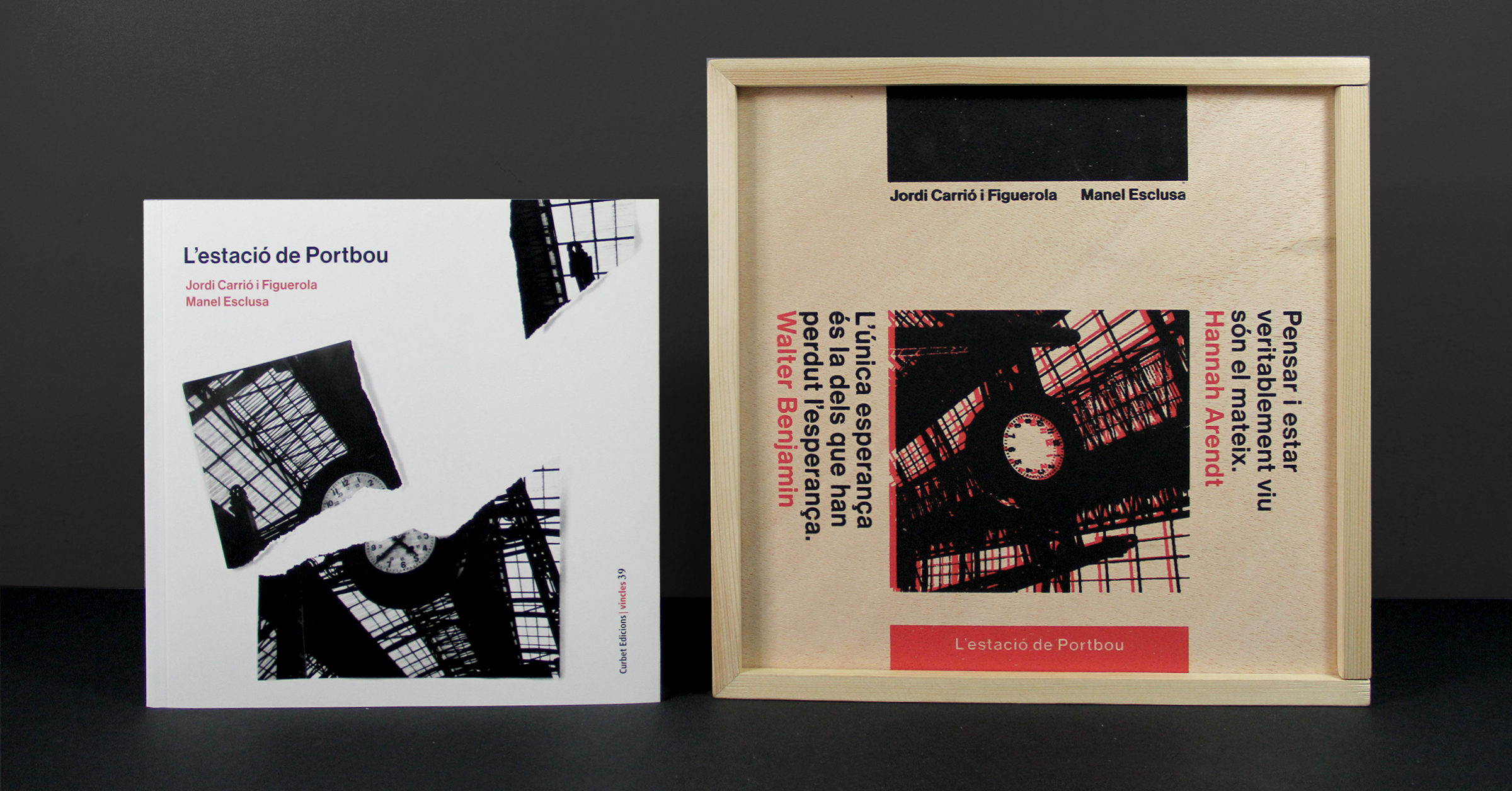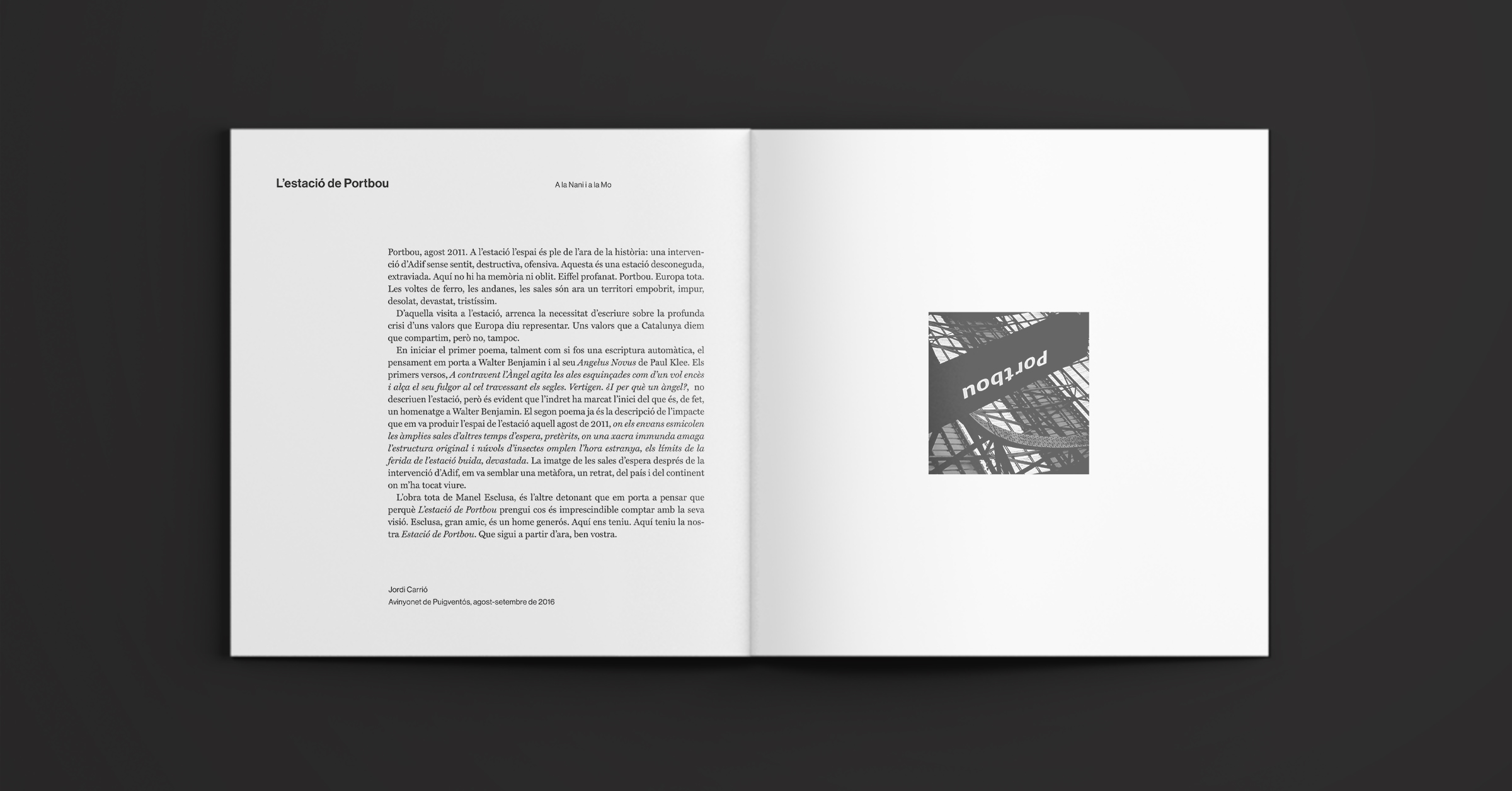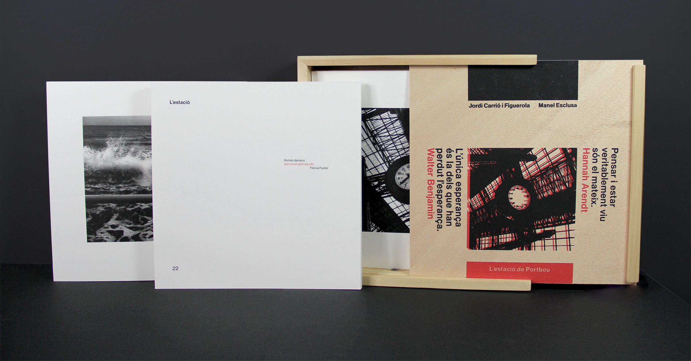 Diseño de libro del escritor catalán Jordi Carrió y el fotógrafo Manel Esclusa "L'Estació de Portbou". Es una doble edición que cuenta con una versión para bibliófilos en caja de madera de 24x24 cm y una versión normal de 21 x 21 cm. El libro combina la poesía de Carrió con las instantáneas de Esclusa. Juegos tipográficos que potencian los versos hasta convertise en imágenes dentro de la página. Poesías: Jordi Carrió | Fotografías: Manel Esclusa | Cuixart-Goday | Curbet Edicions