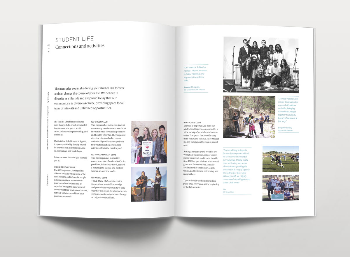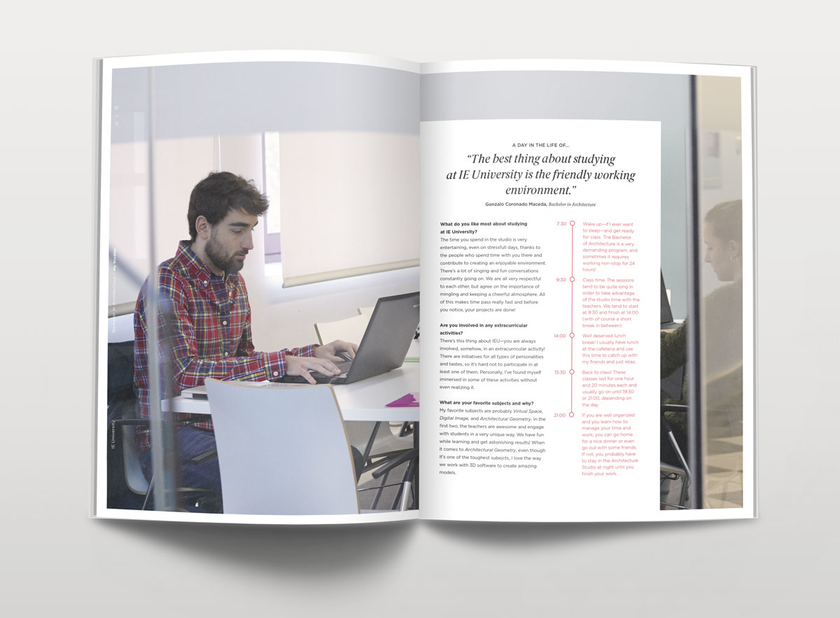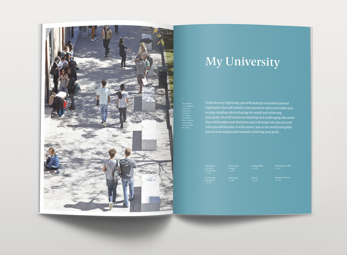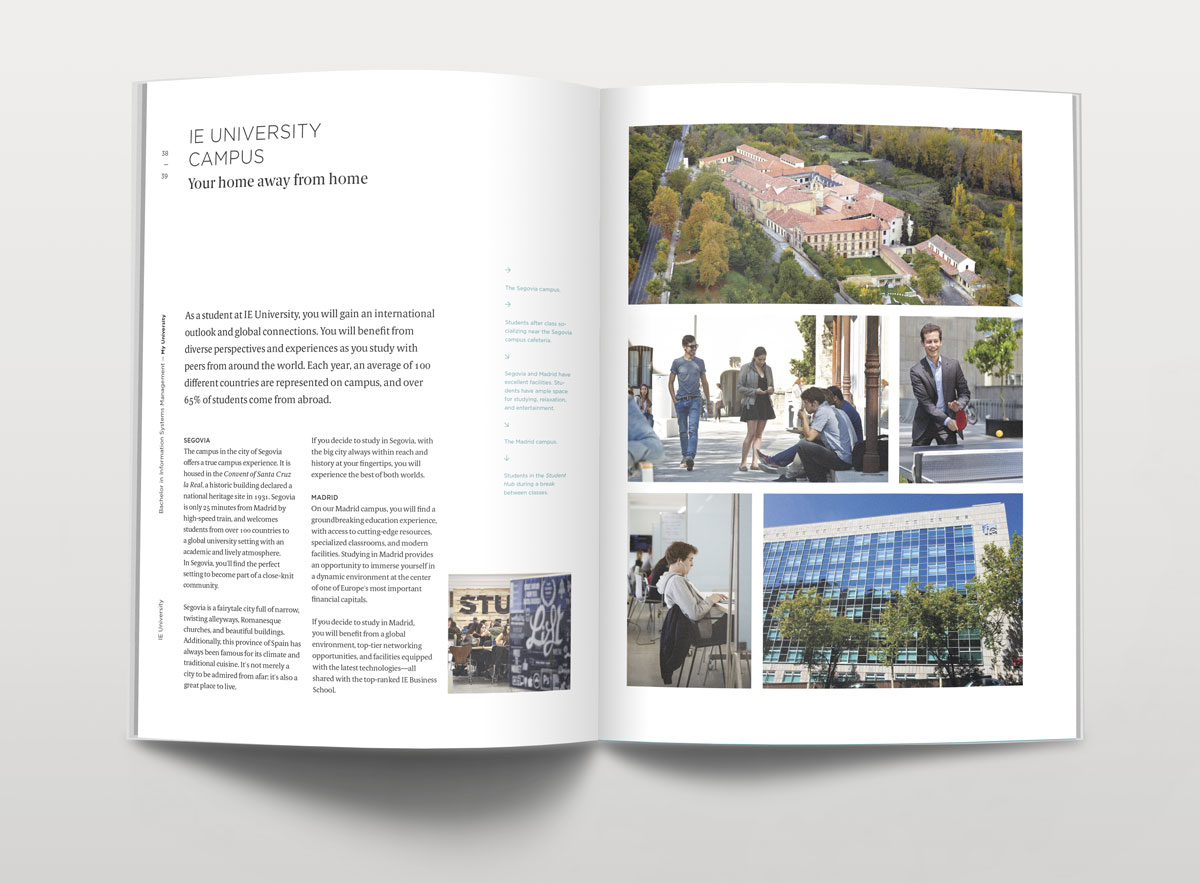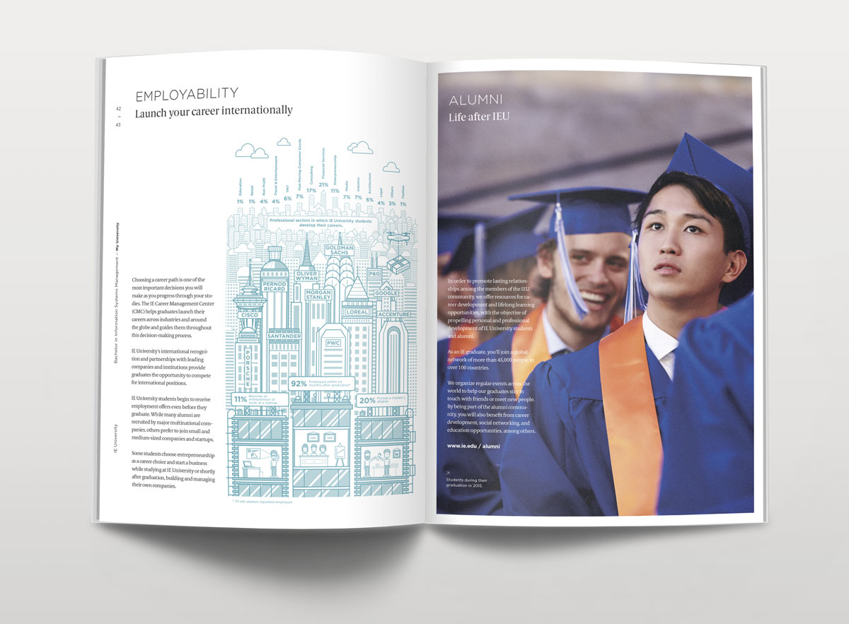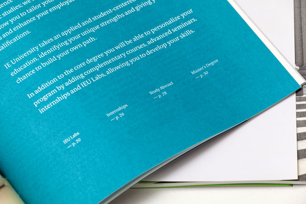 Dirección de arte y diseño editorial del sistema visual para la comunicación 2016 - 2018 para la de los grados de estudio de IE University. Material gráfico que busca combinar diferentes capas de significación: fotografía, contenido, color, testimonios de alumnos y profesores e infografías. El material, con una estructura similar a las revistas, presenta una estructura y un ritmo que permite acceder al contenido según el nivel de interés del propio lector. Realizado para Studio Banana | Fotografías: Agustina Rodriguez y Studio Banana