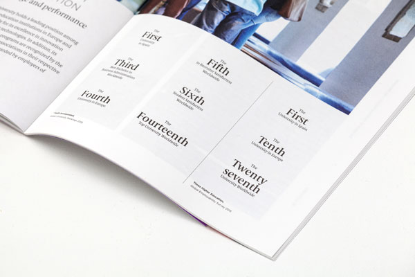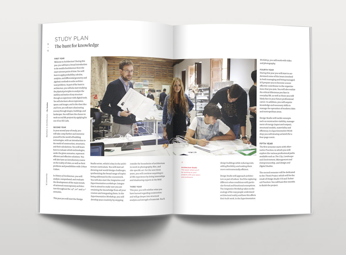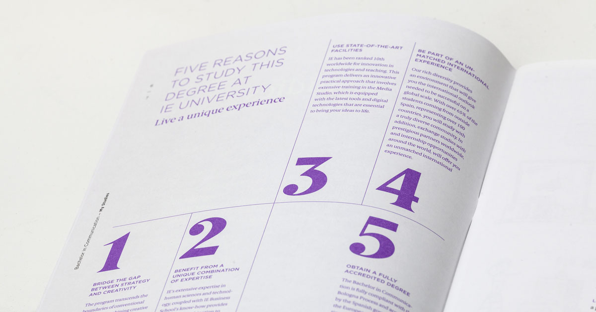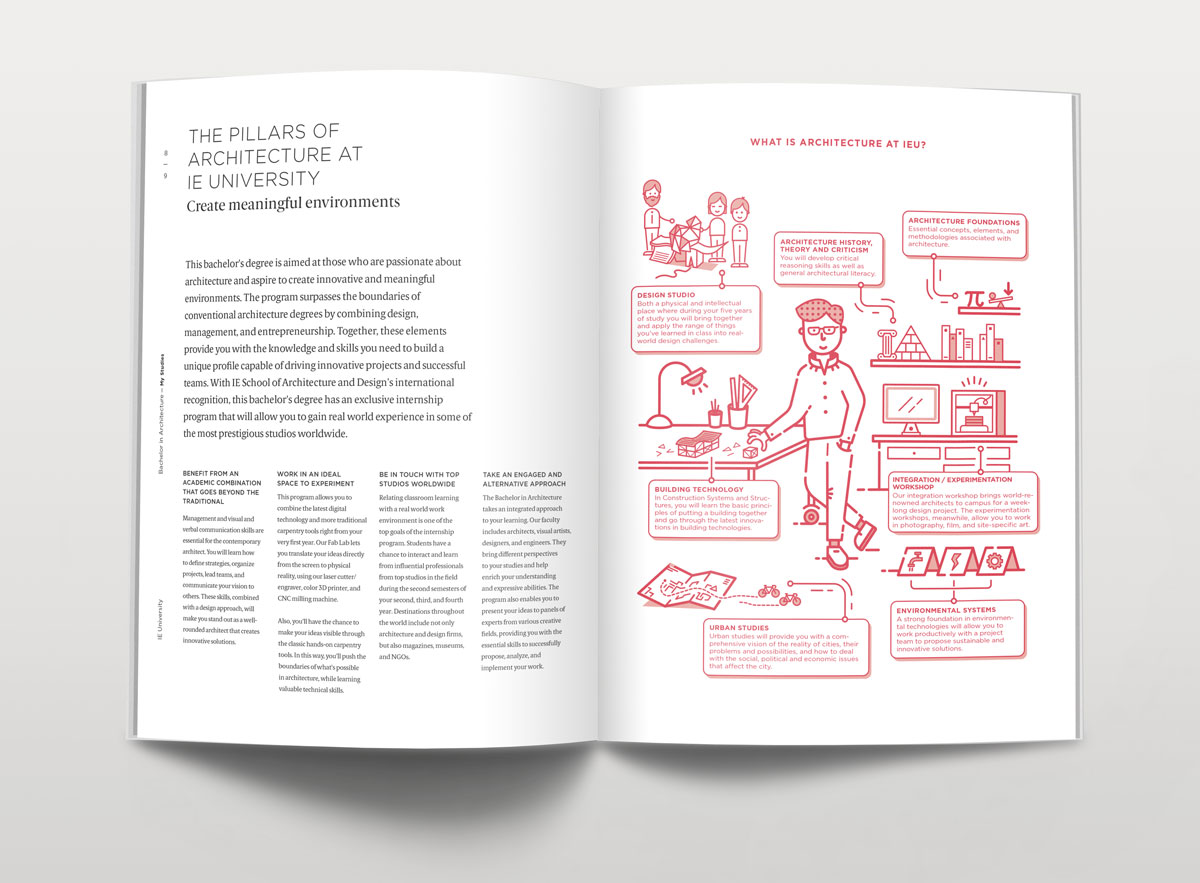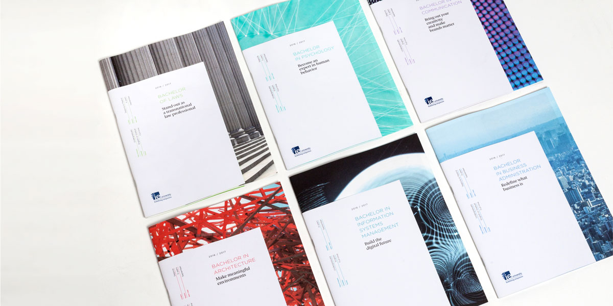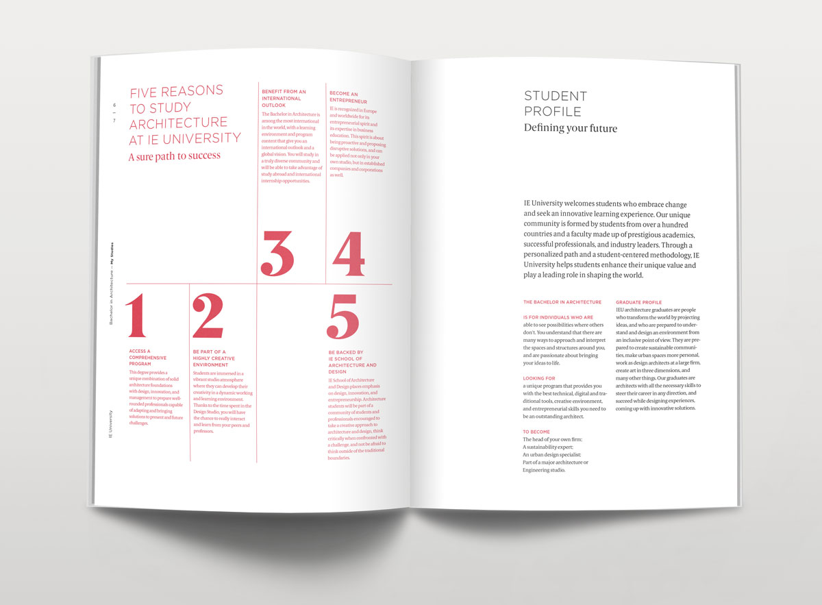 Dirección de arte y diseño editorial del sistema visual para la comunicación 2016 - 2018 para la de los grados de estudio de IE University. Material gráfico que busca combinar diferentes capas de significación: fotografía, contenido, color, testimonios de alumnos y profesores e infografías. El material, con una estructura similar a las revistas, presenta una estructura y un ritmo que permite acceder al contenido según el nivel de interés del propio lector. Realizado para Studio Banana | Fotografías: Agustina Rodriguez y Studio Banana