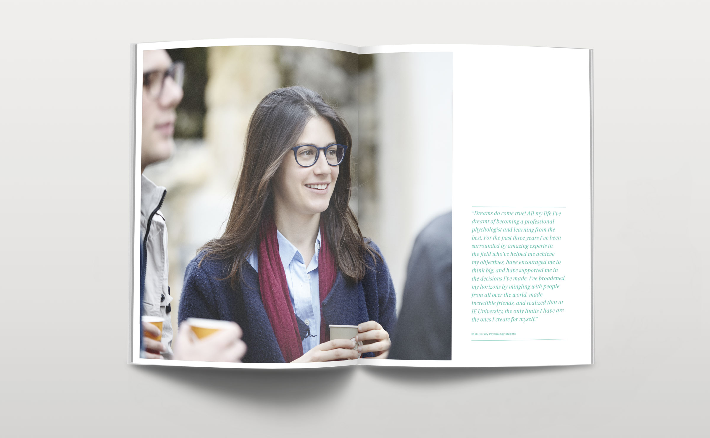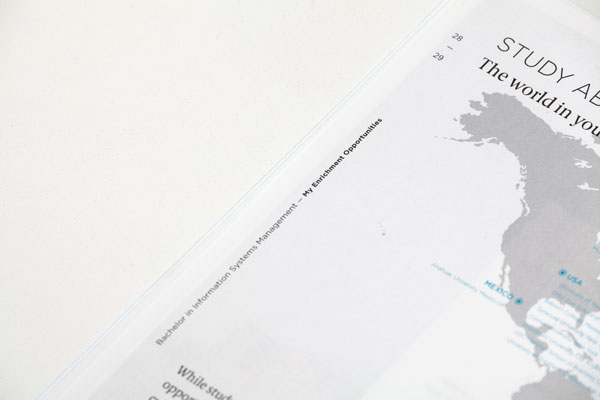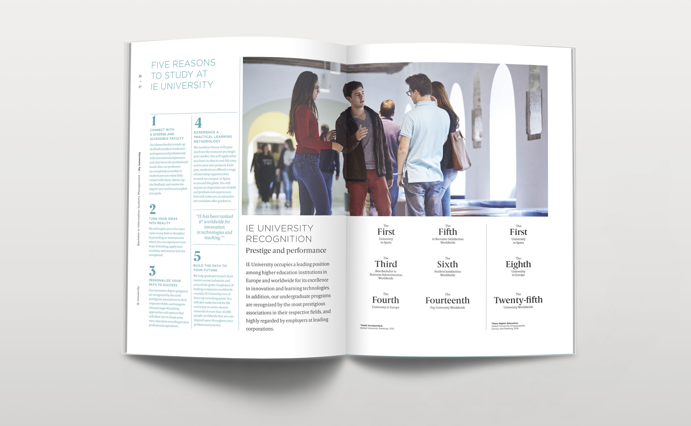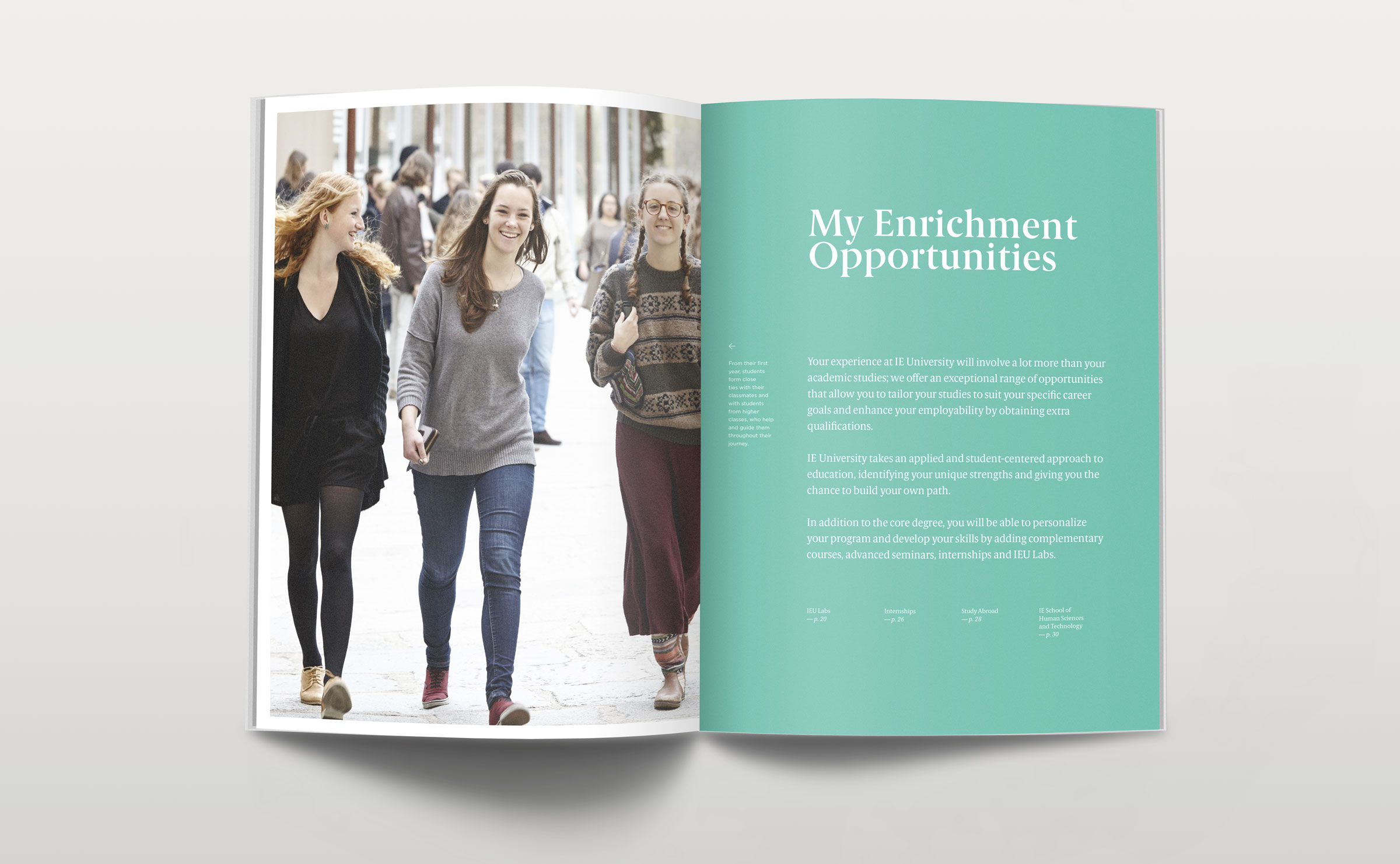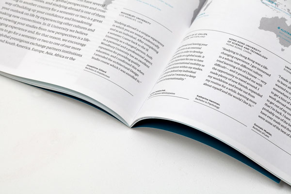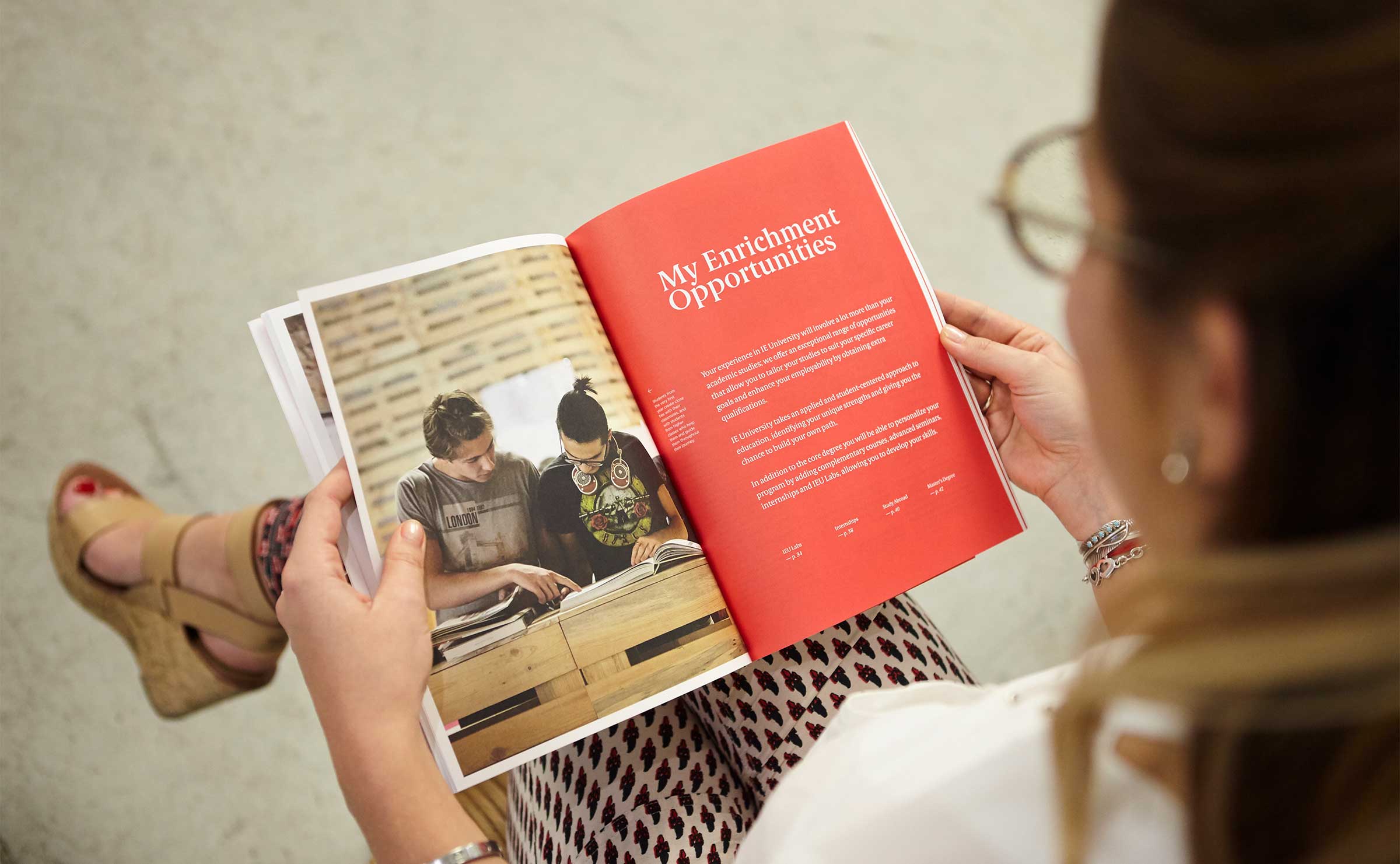 Dirección de arte y diseño editorial del sistema visual para la comunicación 2016 - 2018 para la de los grados de estudio de IE University. Material gráfico que busca combinar diferentes capas de significación: fotografía, contenido, color, testimonios de alumnos y profesores e infografías. El material, con una estructura similar a las revistas, presenta una estructura y un ritmo que permite acceder al contenido según el nivel de interés del propio lector. Realizado para Studio Banana | Fotografías: Agustina Rodriguez y Studio Banana