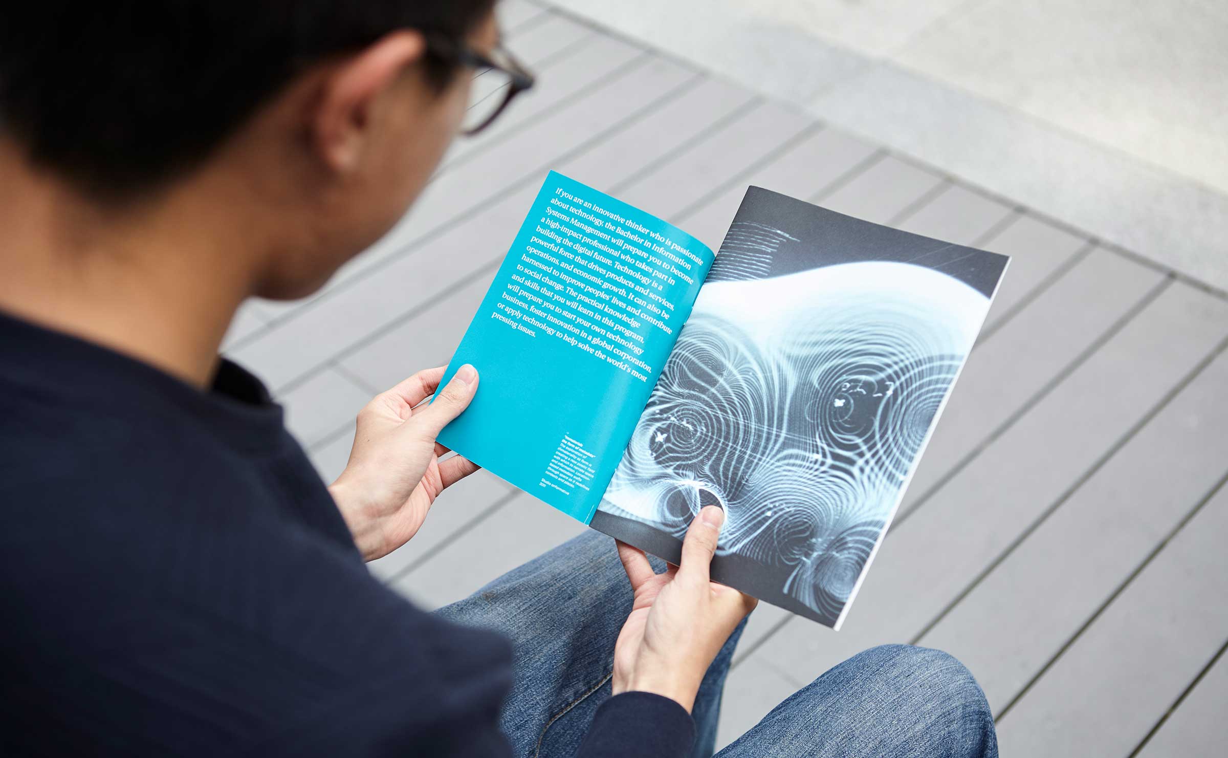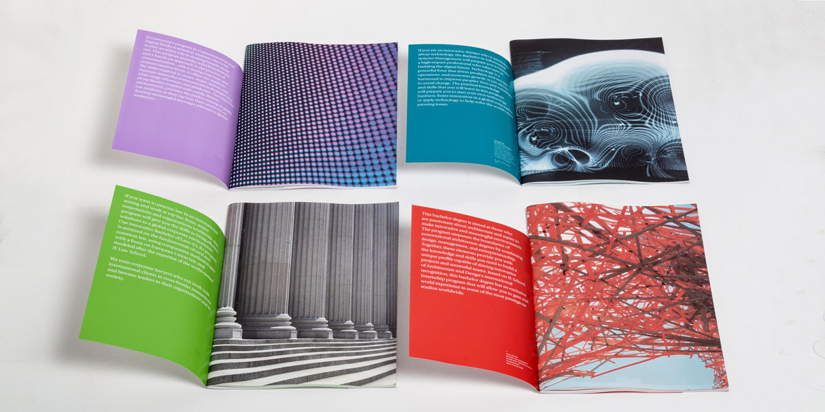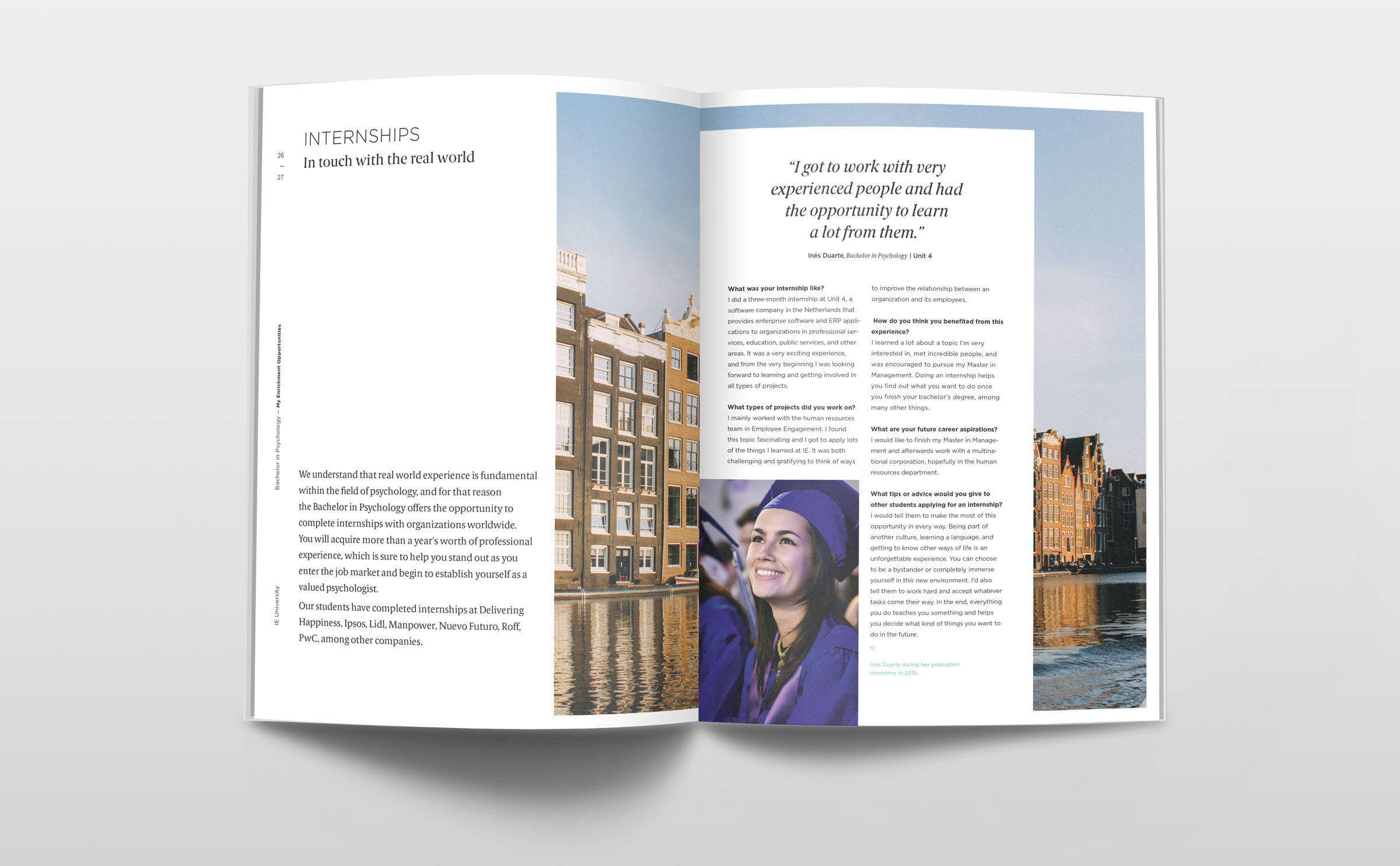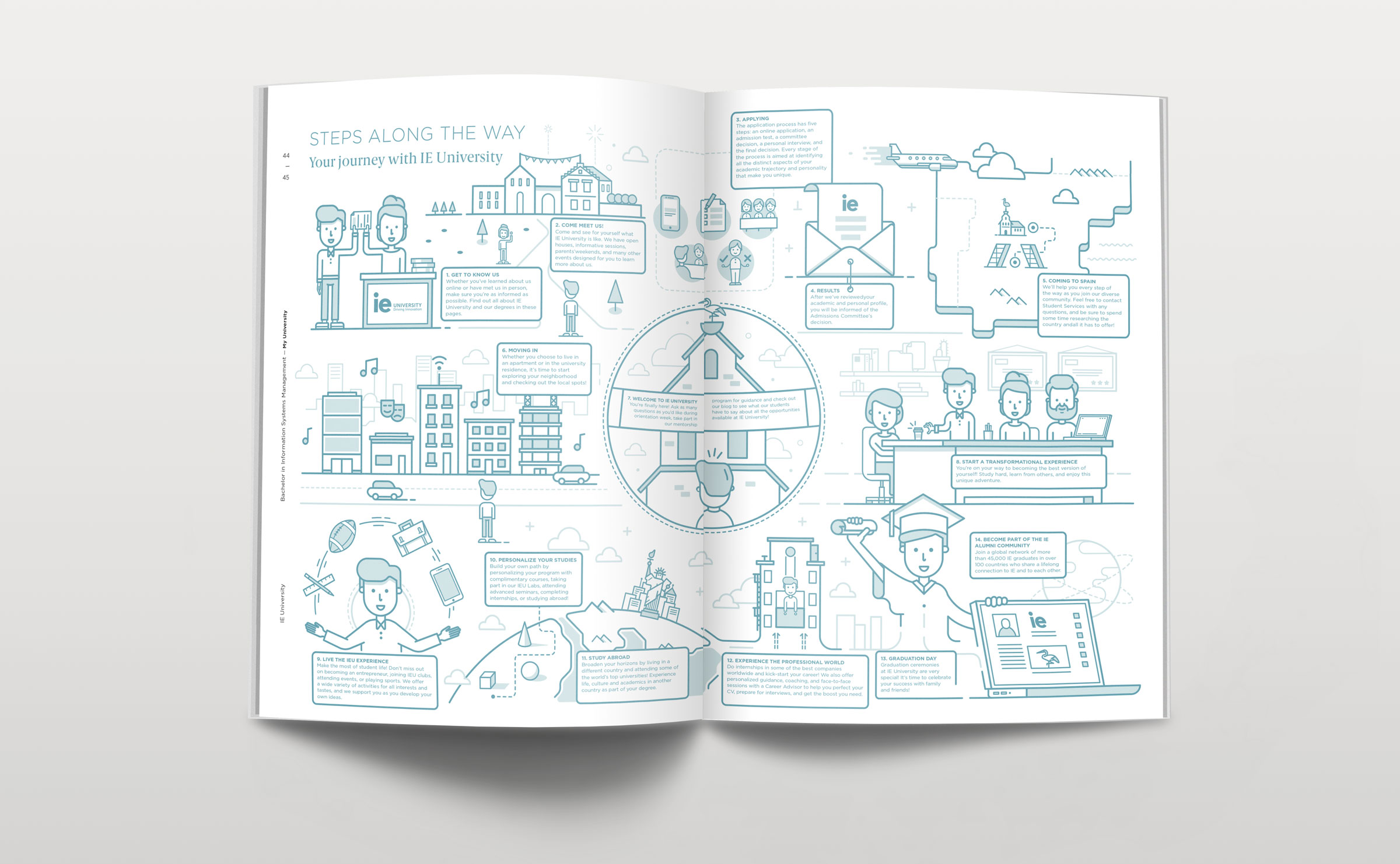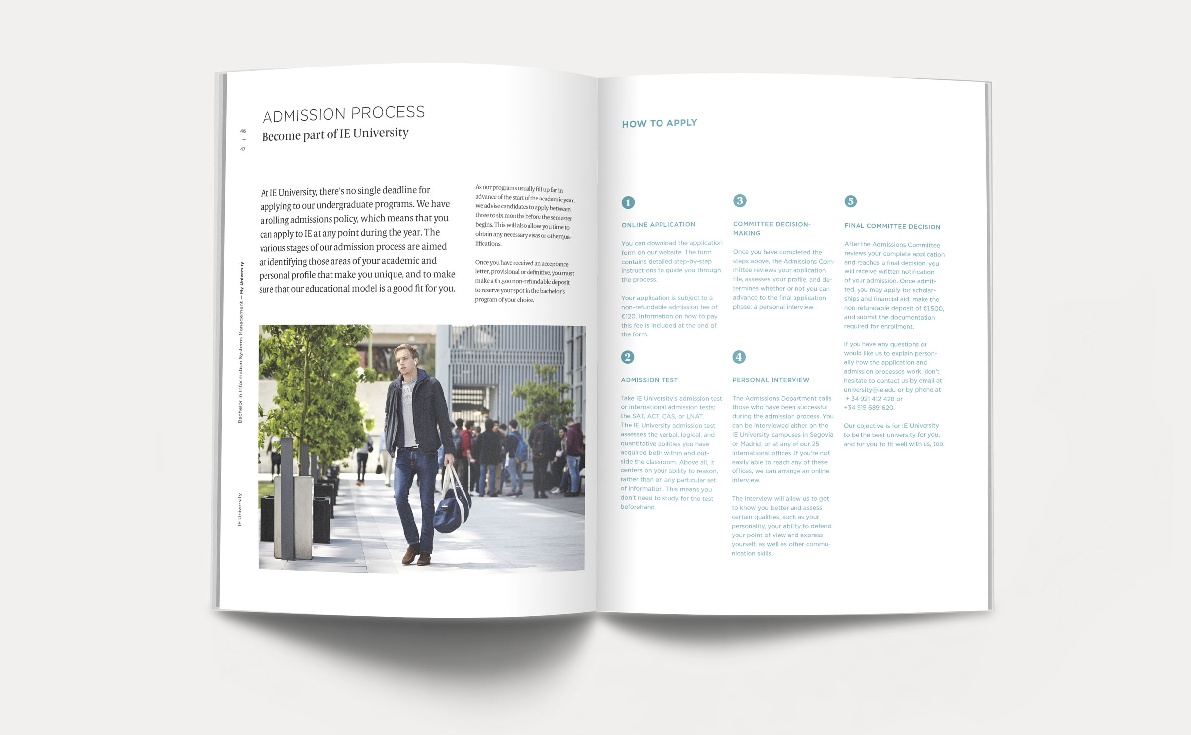 Dirección de arte y diseño editorial del sistema visual para la comunicación 2016 - 2018 para la de los grados de estudio de IE University. Material gráfico que busca combinar diferentes capas de significación: fotografía, contenido, color, testimonios de alumnos y profesores e infografías. El material, con una estructura similar a las revistas, presenta una estructura y un ritmo que permite acceder al contenido según el nivel de interés del propio lector. Realizado para Studio Banana | Fotografías: Agustina Rodriguez y Studio Banana