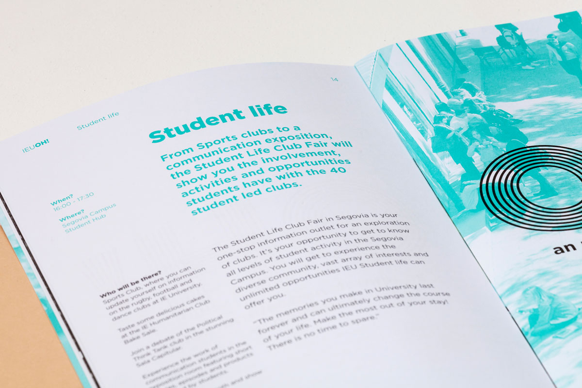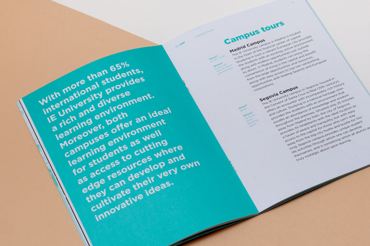 Diseño de identidad del evento de puertas abiertas que organiza IE University dos veces al año para que aquellos futuros alumnos puedan conocer de cerca cada detalle de estudiar en la universidad. Se desarrolló la identidad, material de comunicación como folletos, merchandising y diseño espacial.