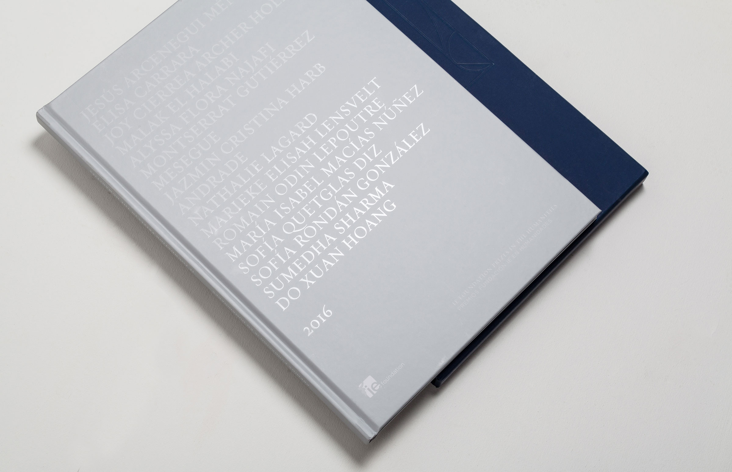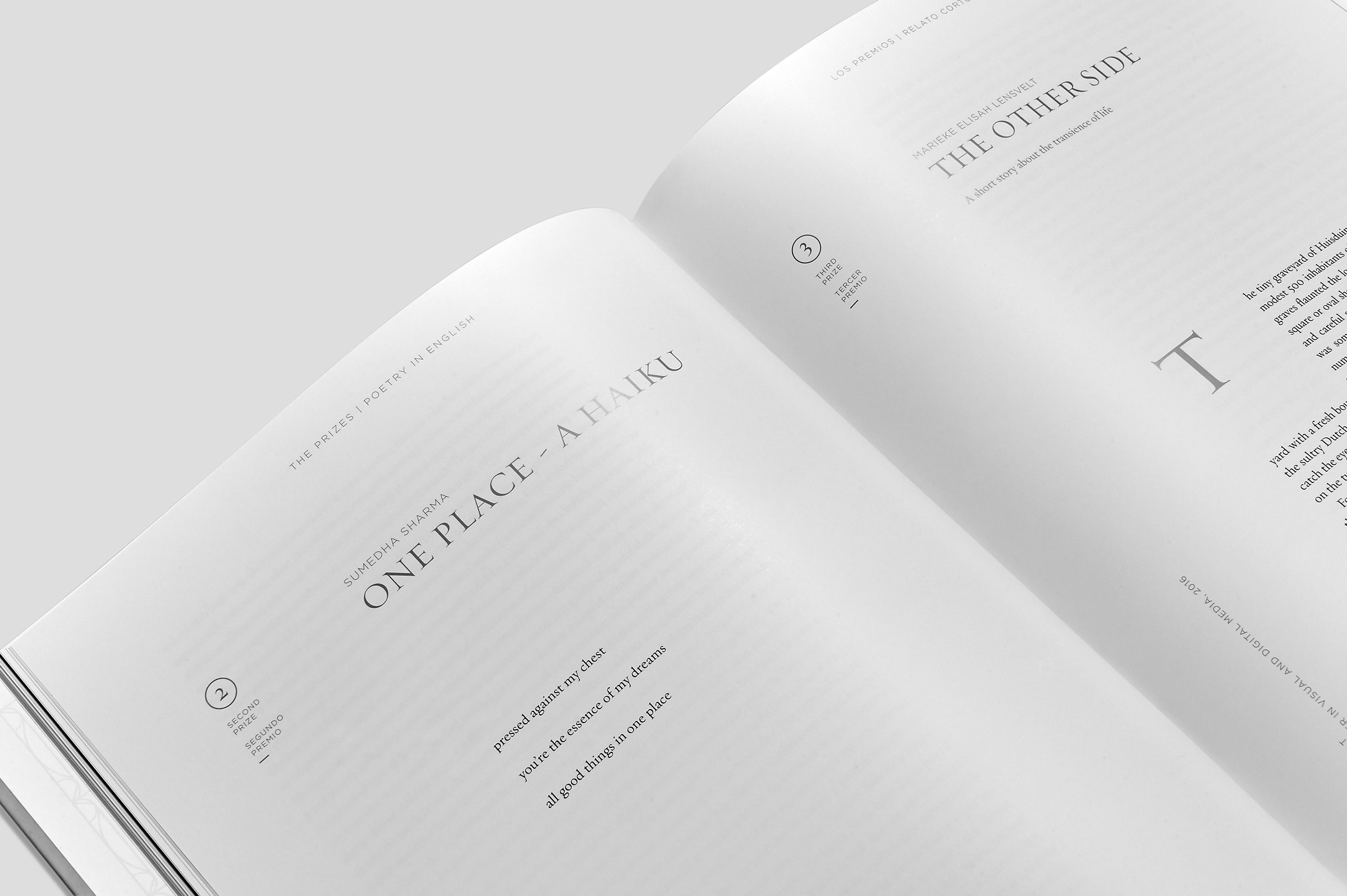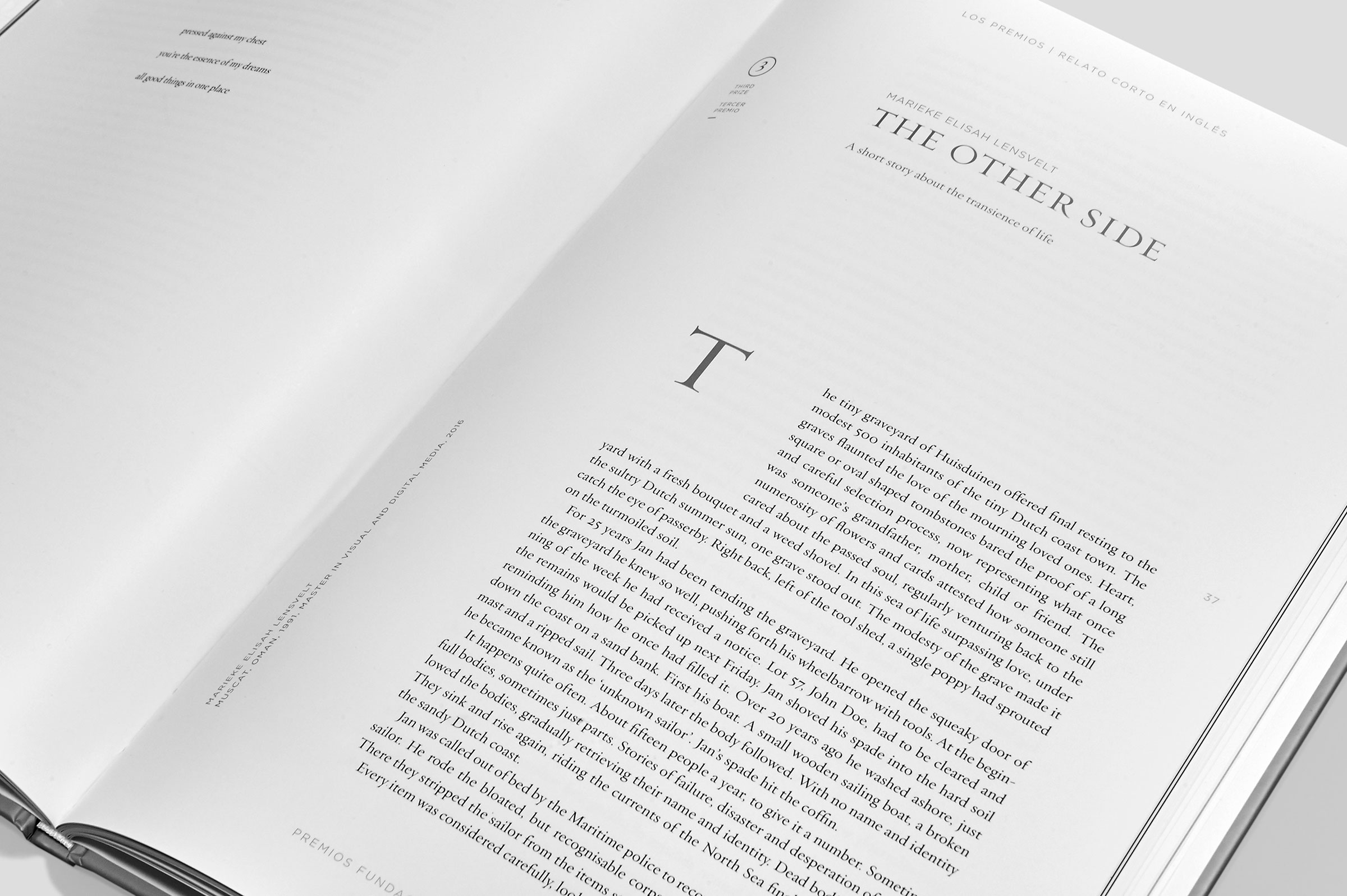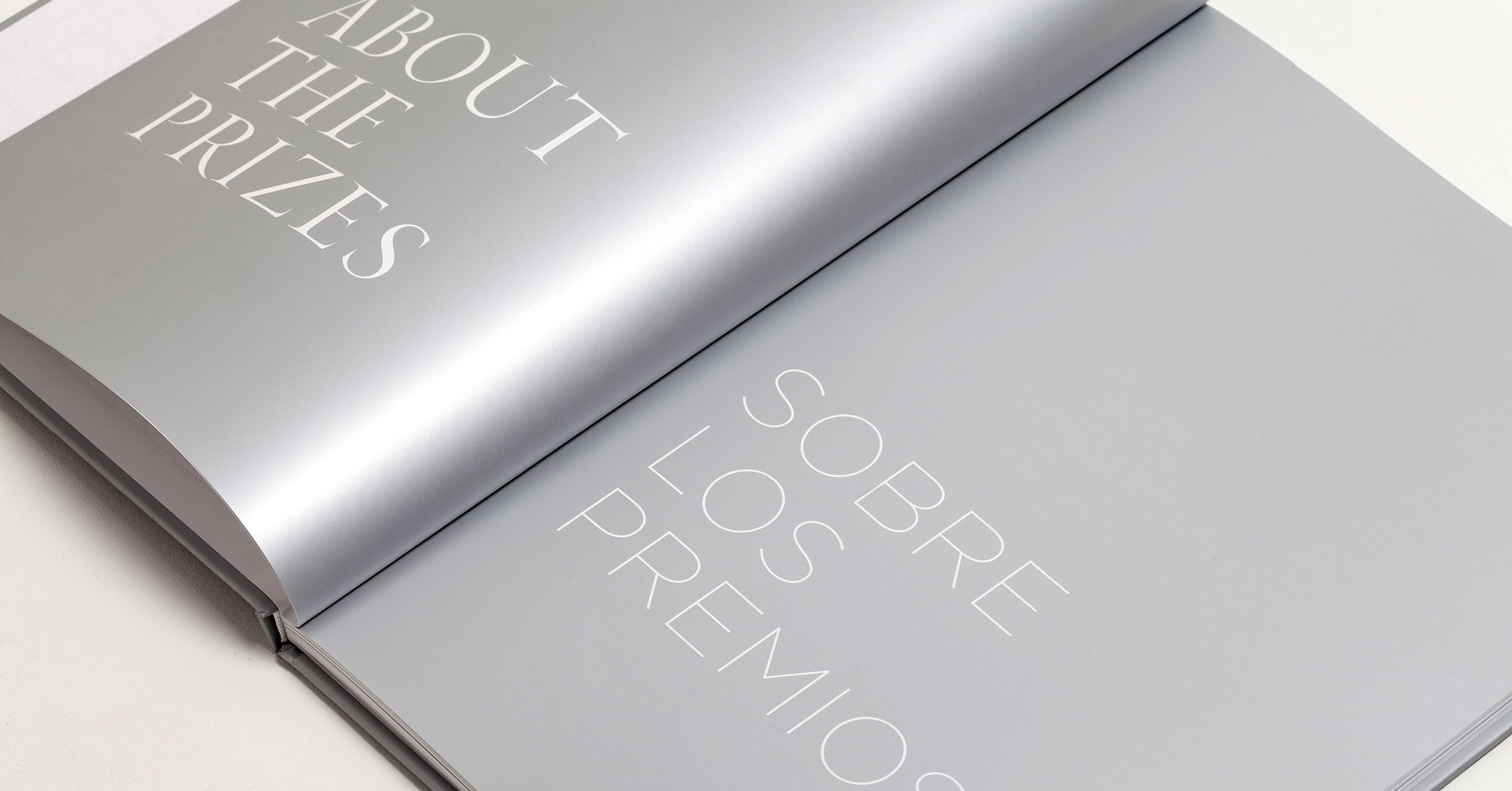 Primera edición de los premios que otorga la IE Foundation a alumnos en diferentes rubros relacionados con la Humanidades. Como todos los años se realiza un libro que contiene todas las obras premiadas y que actúa como trofeo o premio. Por tal motivo el tratamiento de la publicación es espacial y se trabaja con diferentes acabados especiales. Como en todas las ediciones se utiliza la tinta metálica para dotar a este libro de ese carácter de premio, en esta ocasión se empleó el cobre, el cual como segunda tinta inunda toda propuesta gráfica. Realizado para Studio Banana | Fotografías: Agustina Rodriguez