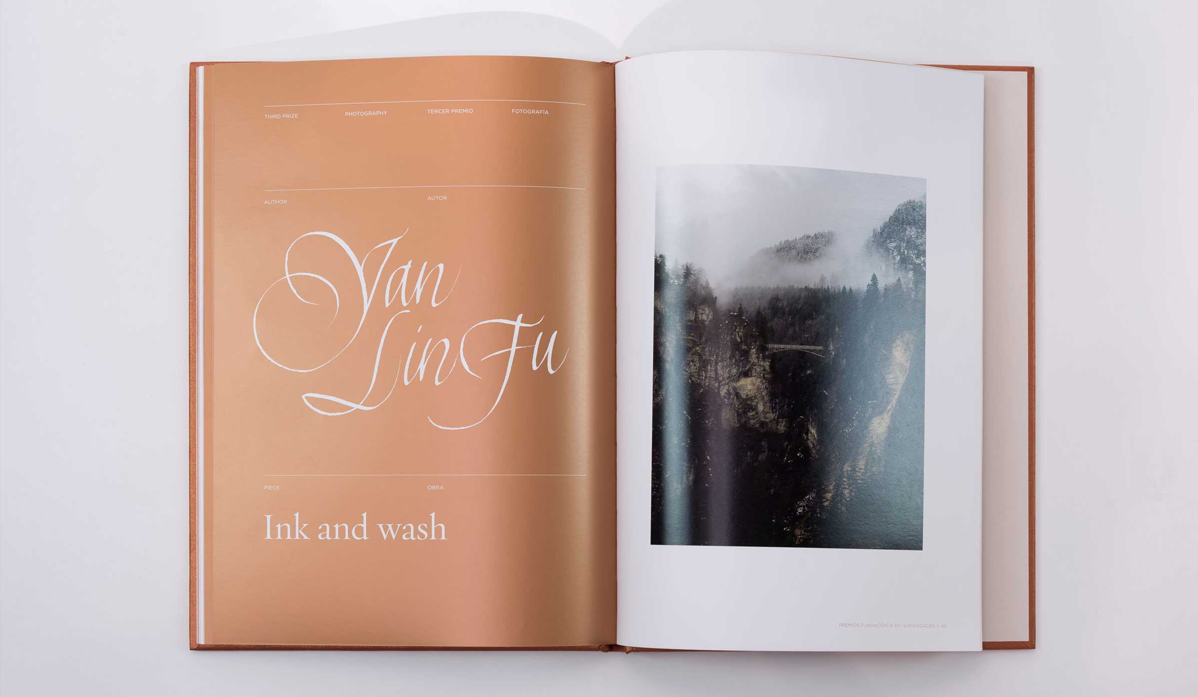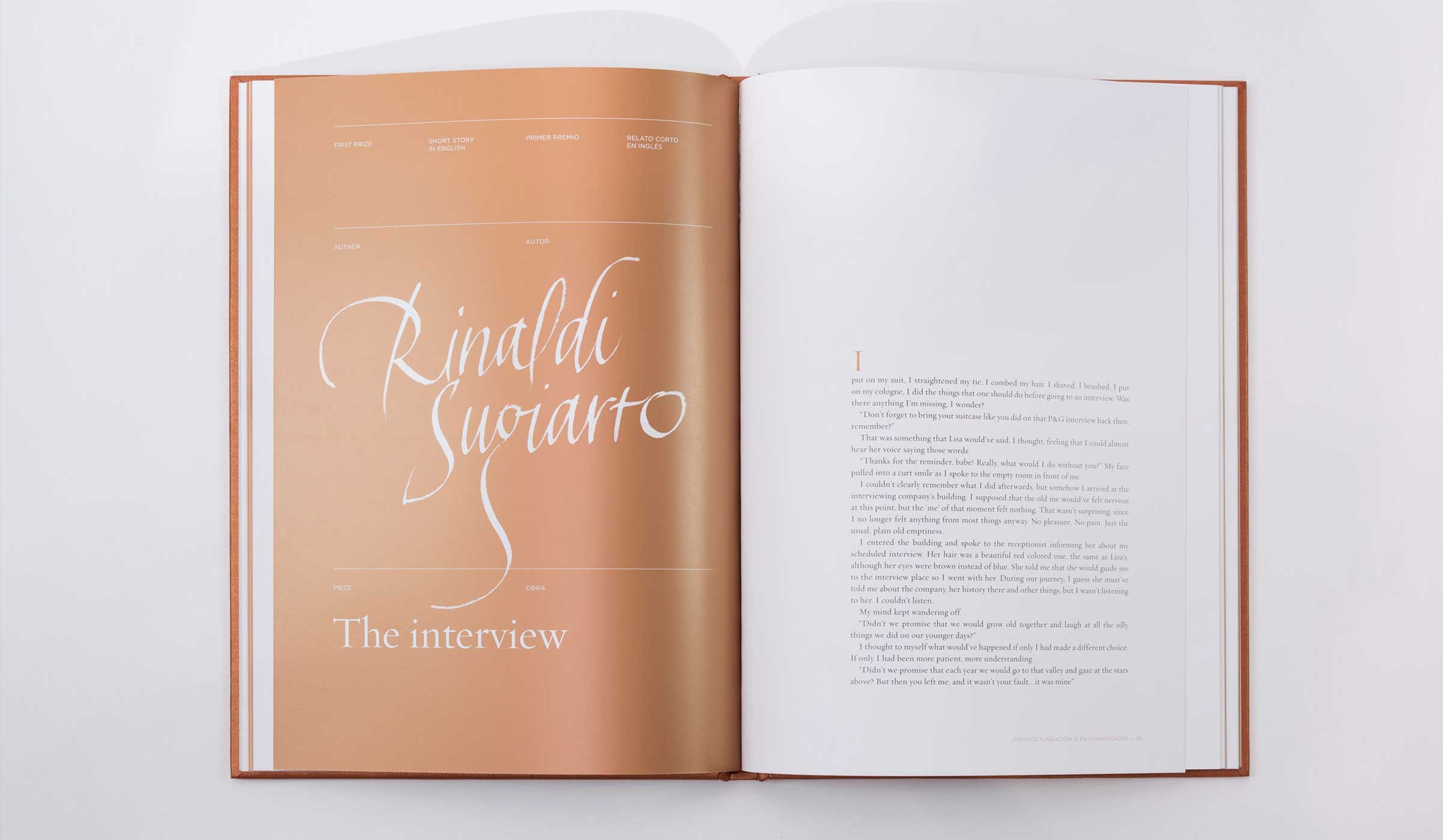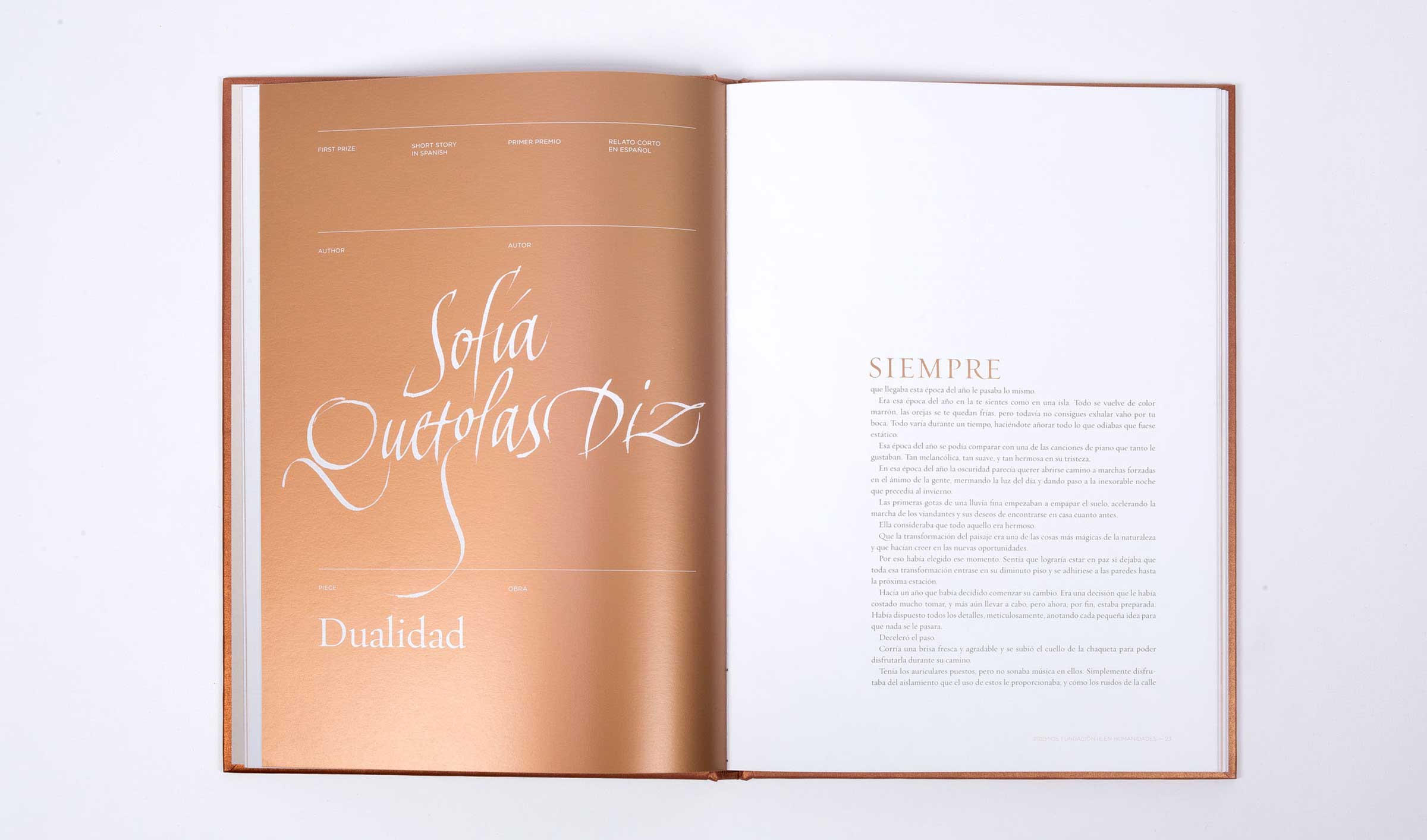 Segunda edición de los premios que otorga la IE Foundation a alumnos en diferentes rubros relacionados con la Humanidades. Como todos los años se realiza un libro que contiene todas las obras premiadas y que actúa como trofeo o premio. Por tal motivo el tratamiento de la publicación es espacial y se trabaja con diferentes acabados especiales. Como en todas las ediciones se utiliza la tinta metálica para dotar a este libro de ese carácter de premio, en esta ocasión se empleó el cobre, el cual como segunda tinta inunda toda propuesta gráfica. Realizado para Studio Banana | Fotografías: Studio Banana