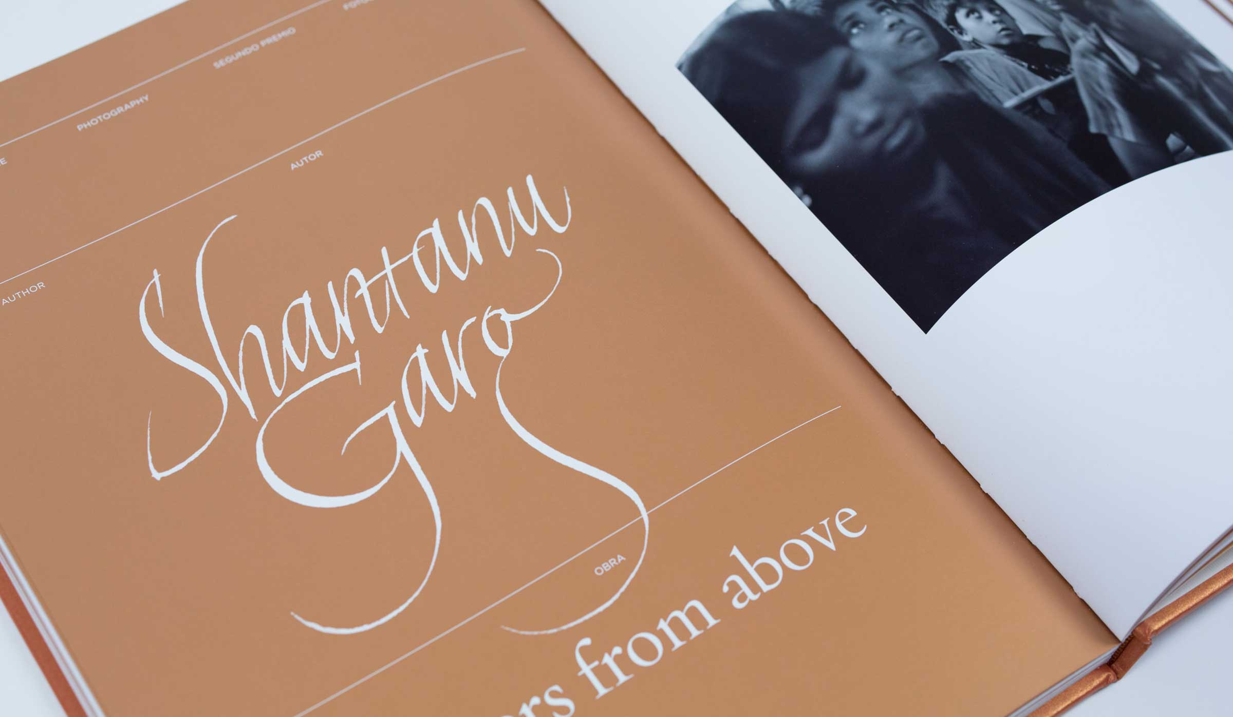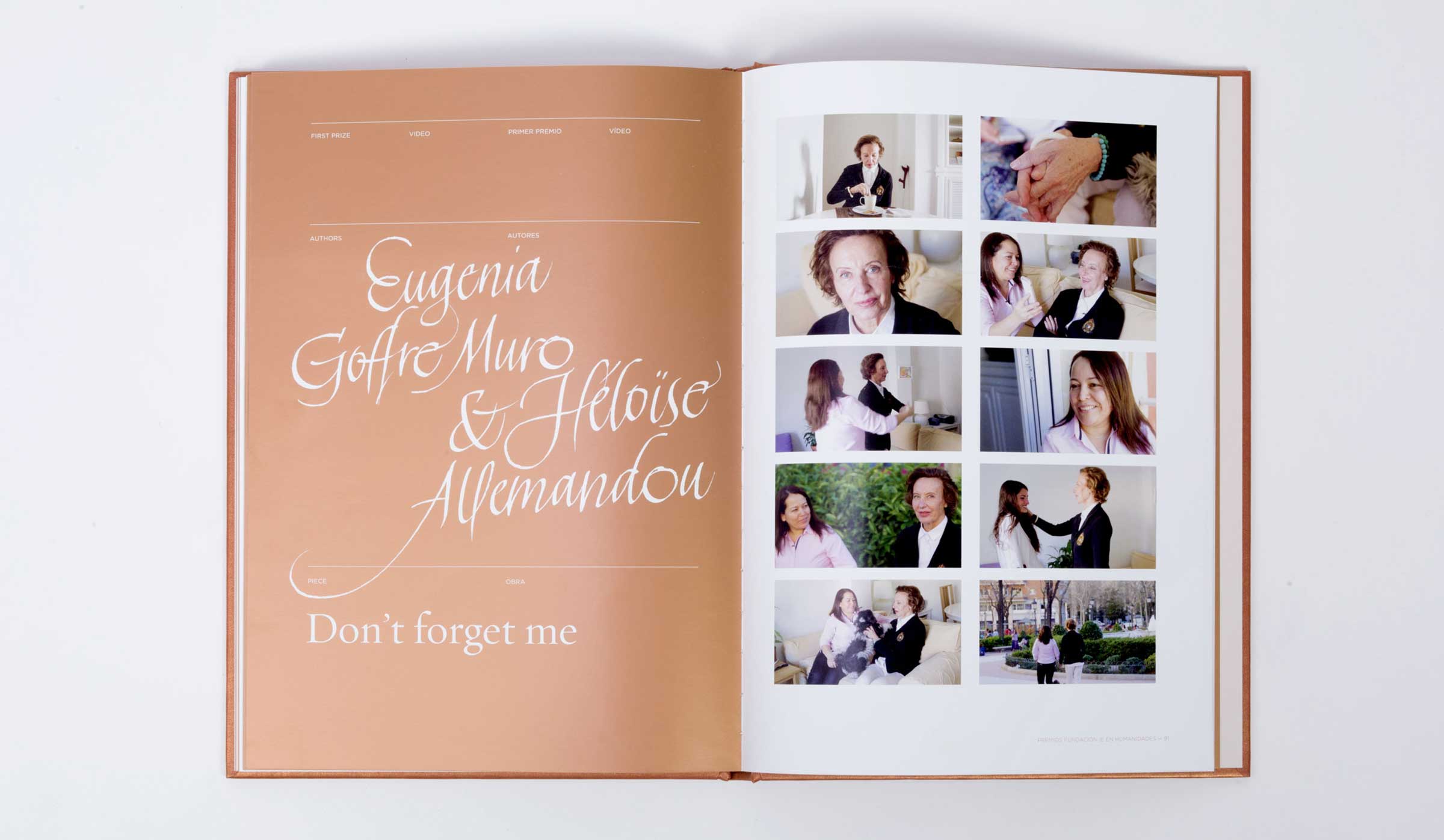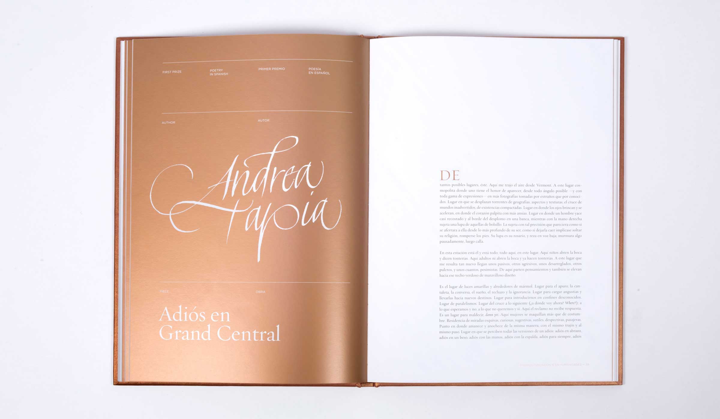 Segunda edición de los premios que otorga la IE Foundation a alumnos en diferentes rubros relacionados con la Humanidades. Como todos los años se realiza un libro que contiene todas las obras premiadas y que actúa como trofeo o premio. Por tal motivo el tratamiento de la publicación es espacial y se trabaja con diferentes acabados especiales. Como en todas las ediciones se utiliza la tinta metálica para dotar a este libro de ese carácter de premio, en esta ocasión se empleó el cobre, el cual como segunda tinta inunda toda propuesta gráfica. Realizado para Studio Banana | Fotografías: Studio Banana